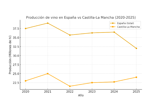 (Gráfico incluido arriba: Producción de vino en España vs Castilla-La Mancha 2020-2025)